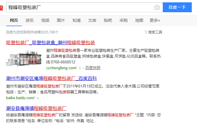 从相关搜索信息出来一些推荐后,如果对于该企业有进一步了解的想法,那么则可以做进一步了解。比如从上面得知程峰吸塑包装厂,那么下面可以进行搜索:程峰吸塑包装厂